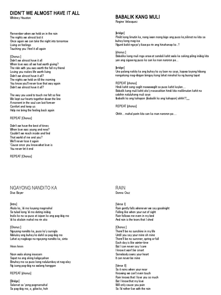 Philippines English title complete title Your Song Presents Babalik kang muli. Babalik kang Muli by Regine Velasquez.